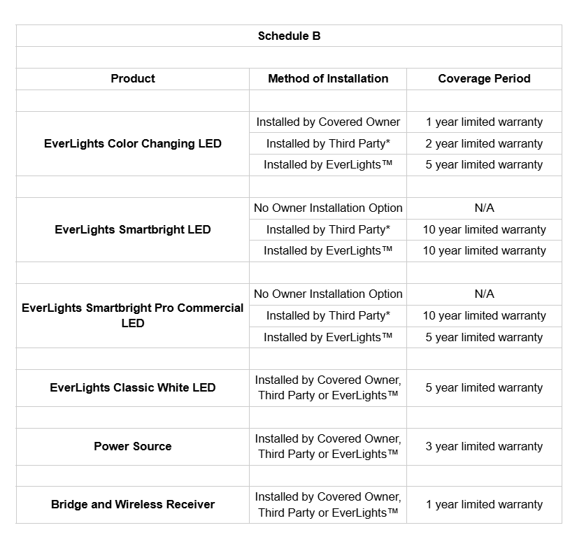 * In the event installation is completed by a third-party installer, EverLights recommends that the Covered Owner enter into a labor warranty and a maintenance contract.