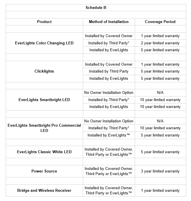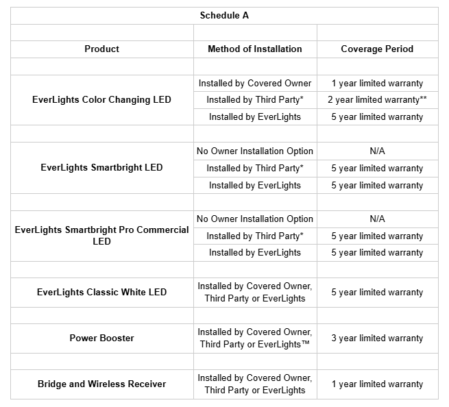 * In the event installation is completed by a third-party installer, EverLights recommends that the Covered Owner enter into a labor warranty and a maintenance contract.